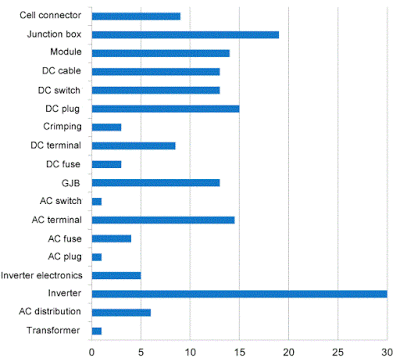 圖4統(tǒng)計174個因火災(zāi)而元件受損案例的元件位置,可以發(fā)現(xiàn)DC端的損壞最多,但是AC端的故障率也意外的高。雖然看數(shù)字是低於DC端元件,但是AC端元件數(shù)量比DC端少很多(大約1/10的程度),而且AC的技術(shù)人員通常受過比較嚴(yán)謹(jǐn)?shù)挠?xùn)練,這麼高的故障率讓人意外。另外特別說明,這裡所列的是燒毀受損的元件,但受損元件未必就是火災(zāi)的原因。圖5做了更細(xì)的統(tǒng)計,受損元件大部分集中在模組與逆變器,DC接頭和壓接頭(crimping)合起來的數(shù)量僅次於模組損傷,也是重要問題。AC部份最多的是AC端子,大部份是人為安裝失誤。